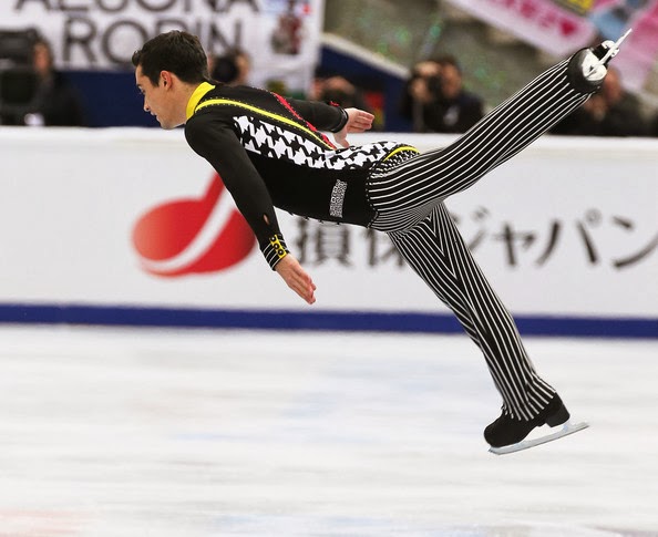 Yuzuru Hanyu of Japan, Free Skate to Romeo and Juliet by Nino Rota--Yuzuru Hanyu, who won the gold medal at last night's Sochi 2014 Winter Olympics, wore this ensemble above. It was designed by Johnny Weir--yes, THE Johnny Weir. I love me some Johnny but this is a little bit of a mess. When I first saw this costume--several competitions ago--I kind of liked it. But now, with closer "Olympic" inspection, I have to rethink my costume critique. There's little rhyme or reason to the white and black ombre and then the multicolored crystals and it has little to do with "Romeo and Juliet". I liked Michael Christian Martinez of the Philippines' costume much better for this same music. I do like the fact that there are asymmetrical lines in the design which keeps the look (at the very least) interesting, but it just seems a bit all over the place. In the end, that didn't matter since he got the gold...